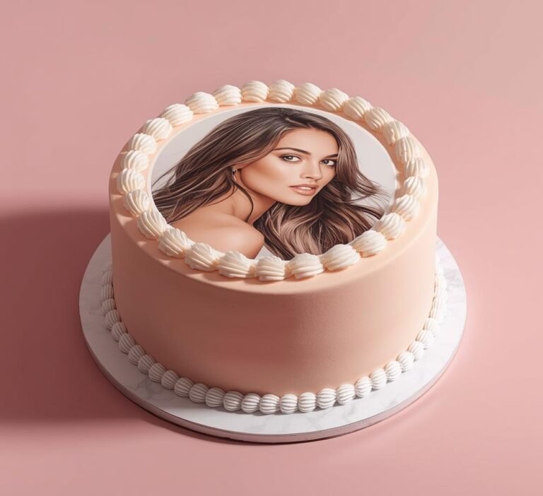 Close-up of a beautifully decorated vanilla cream cake topped with fresh strawberries and elegant chocolate details.